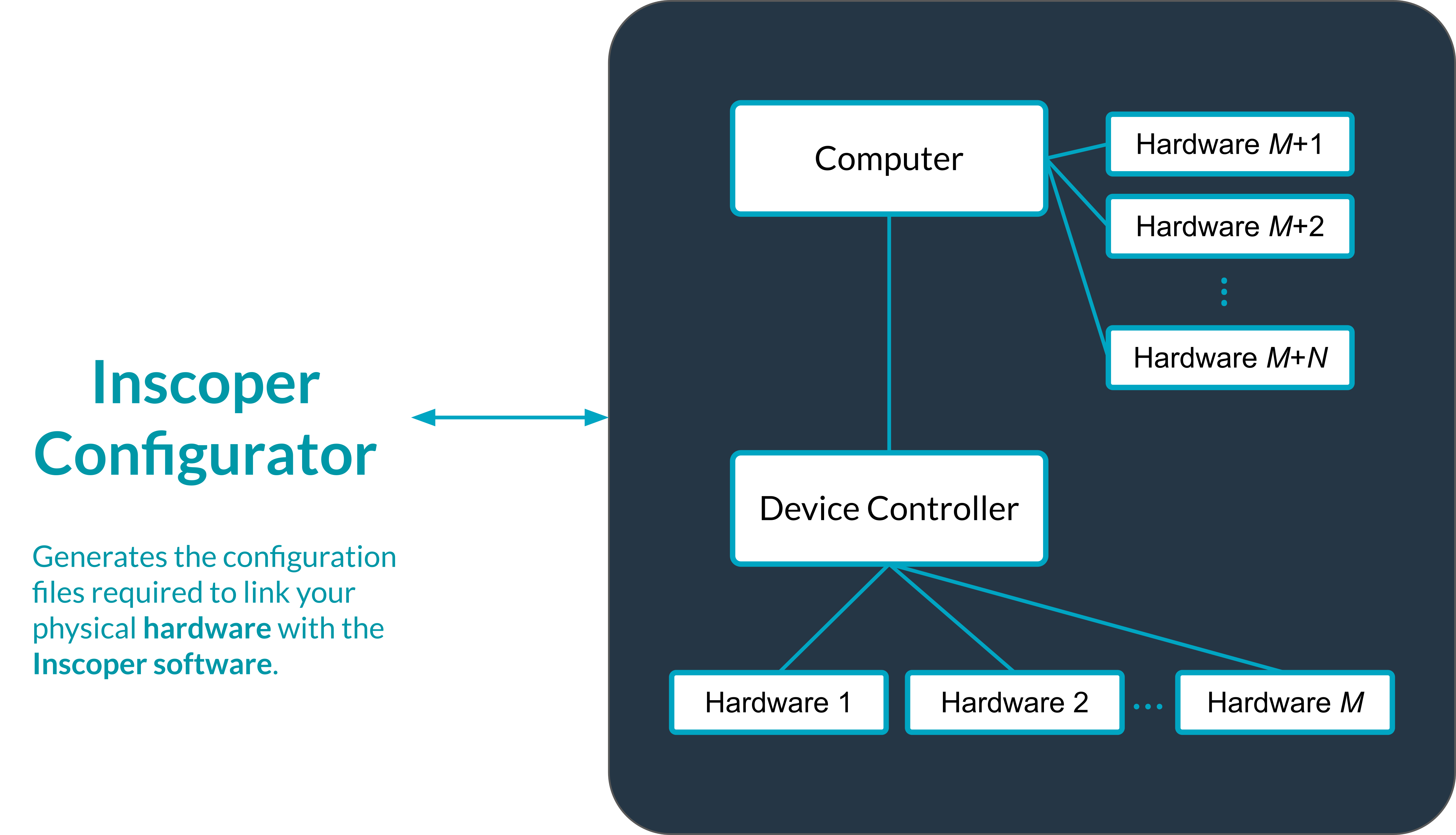 Hardware Structure and Configurator Integration: The diagram below presents the physical hardware setup and how each component is connected. It illustrates how the Configurator interprets this hardware layout. Its role is to convert the material structure into a configuration usable by Inscoper software.
